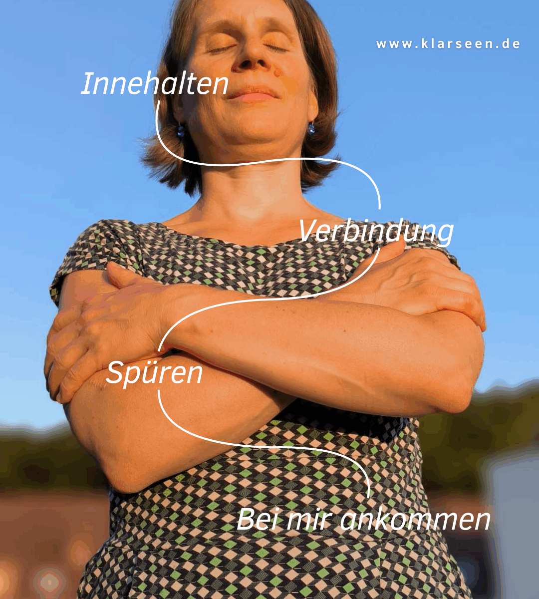 - Über Kreuz legst du deine Hanflächen auf die gegenüberliegenden Schultern und nimm wahr, wie Wärme auf deine Schulter strahlt. Verweile dort mindestens 3 Sekunden.
